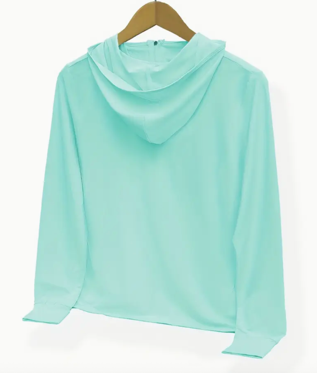 This lightweight, breathable hoodie can be worn year round! Wear in the spring and summer as a light cover-up or in the fall and winter with turtlenecks and layers! The pretty cyan color looks fabulous with so many colors!