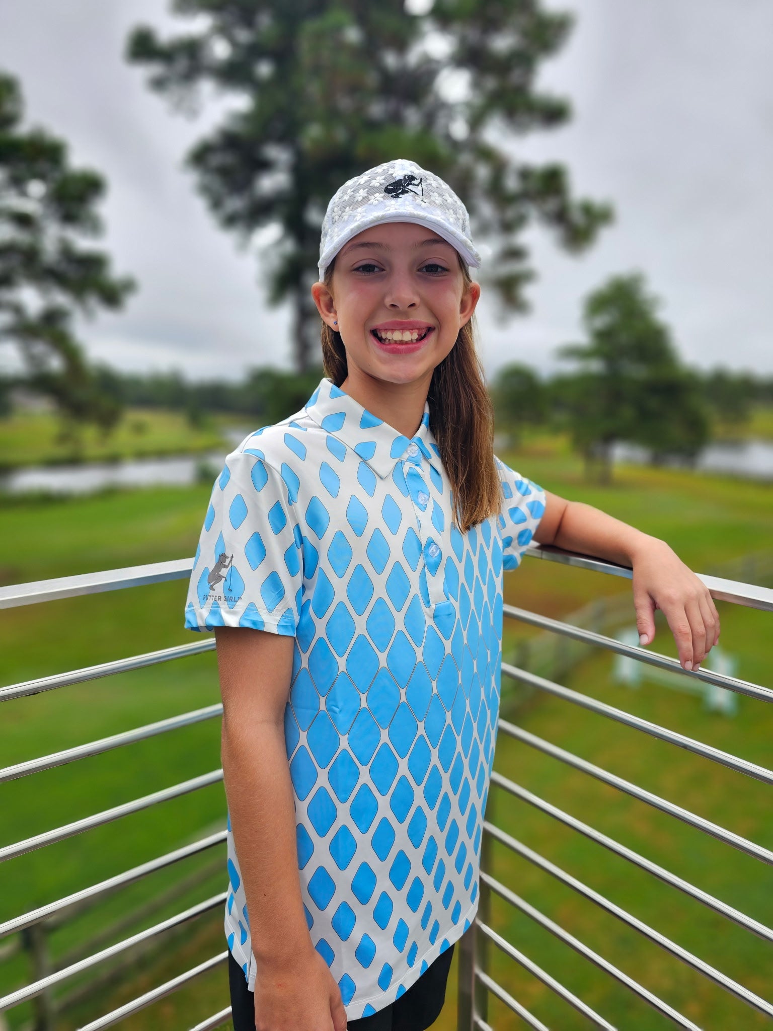 Glow like a gem in this cozy polo! Featuring soft blue tones edged with grey, it pairs perfectly with our Putter Girl Spring Shorts in grey or any white skirt from our collection. Ideal for a fun team look too!