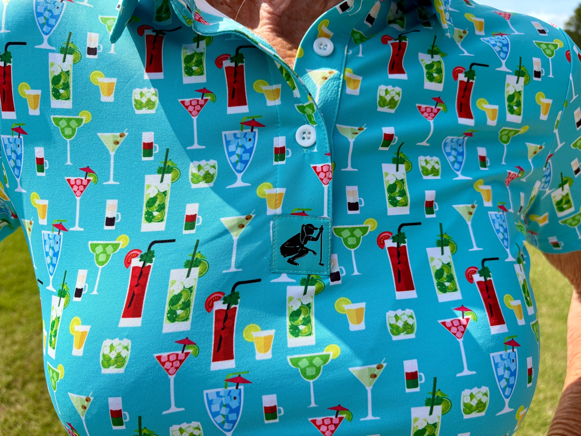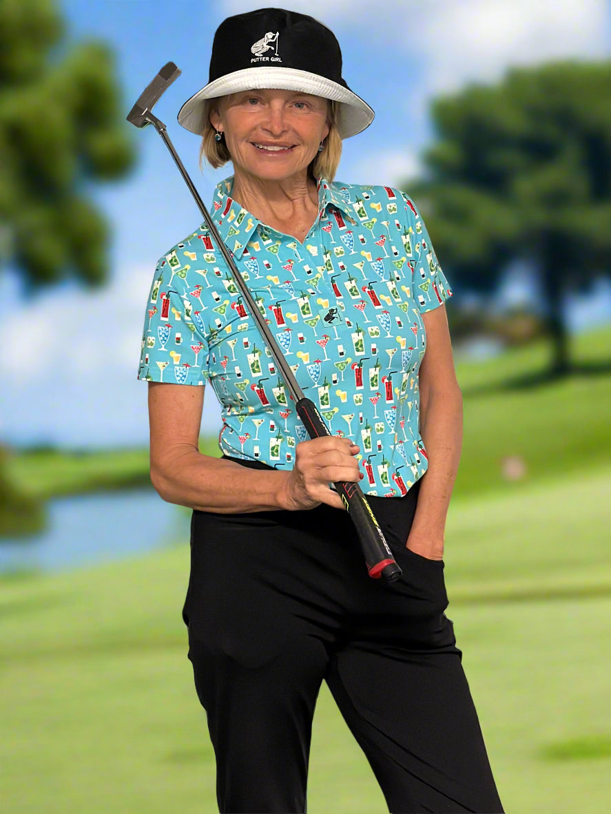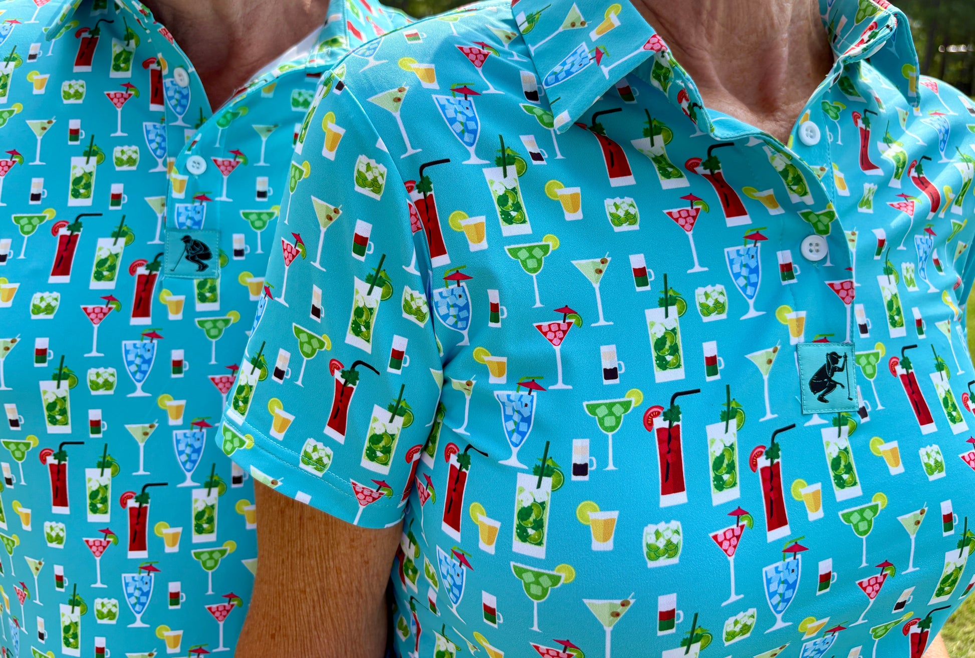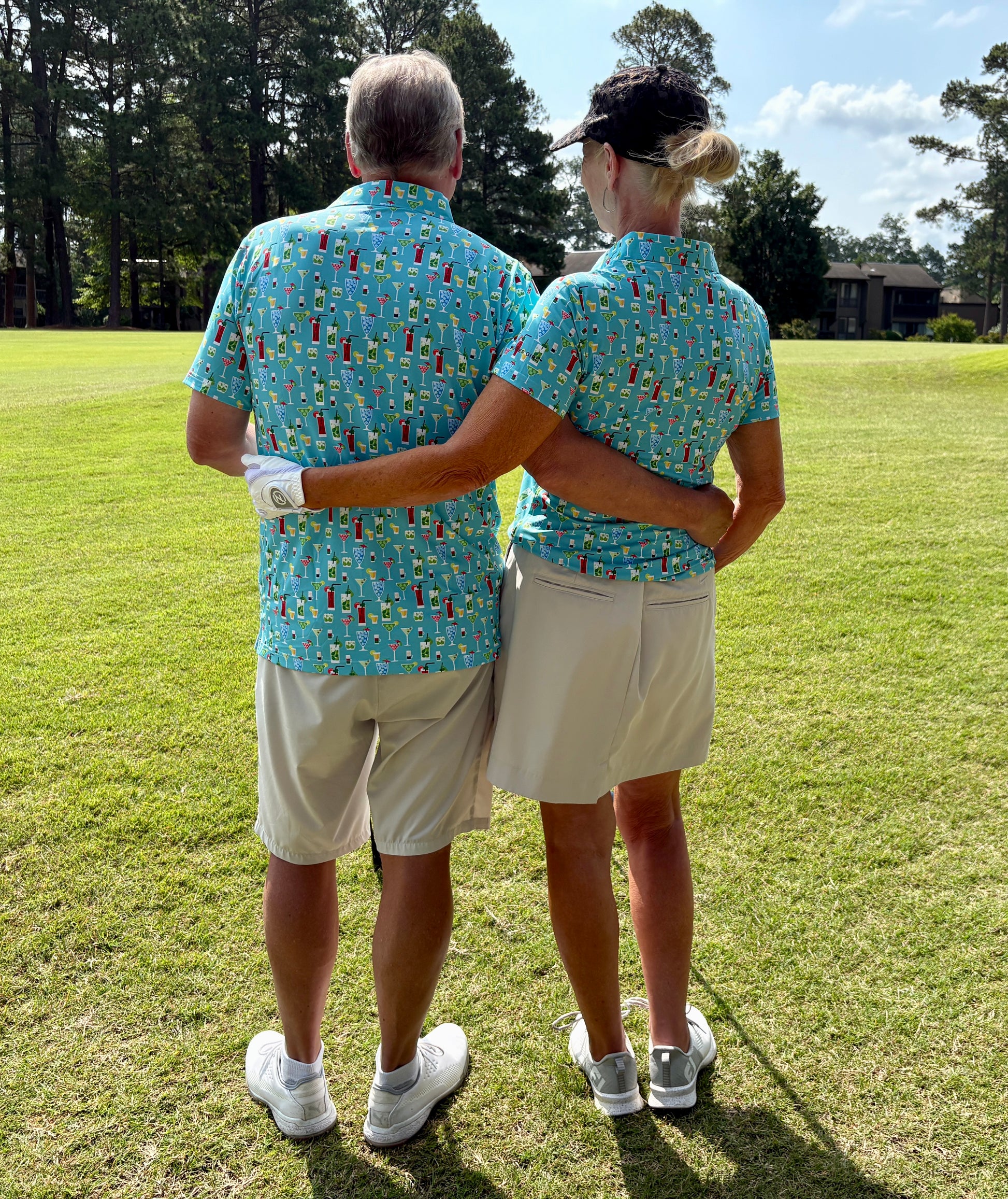 Unleash your playful side with our Cheers Short Sleeve Polo! This fun print showcases all sorts of drinks, making you want to get more birdies for a chance to celebrate with "birdie juice"! Choose from a button down sleeveless or a short sleeved version for women, both featuring the iconic Putter Girl logo. And now we have a Putter Guy Short Sleeve polo, too! Get ready to smile and have a blast on the course! Match your favorite Guy on or off the course! Available in Men's sizing Small to 2 XL and Women's in Small to 4 XL. We are finding this new shirt running a little small so we are recommending sizing up one!