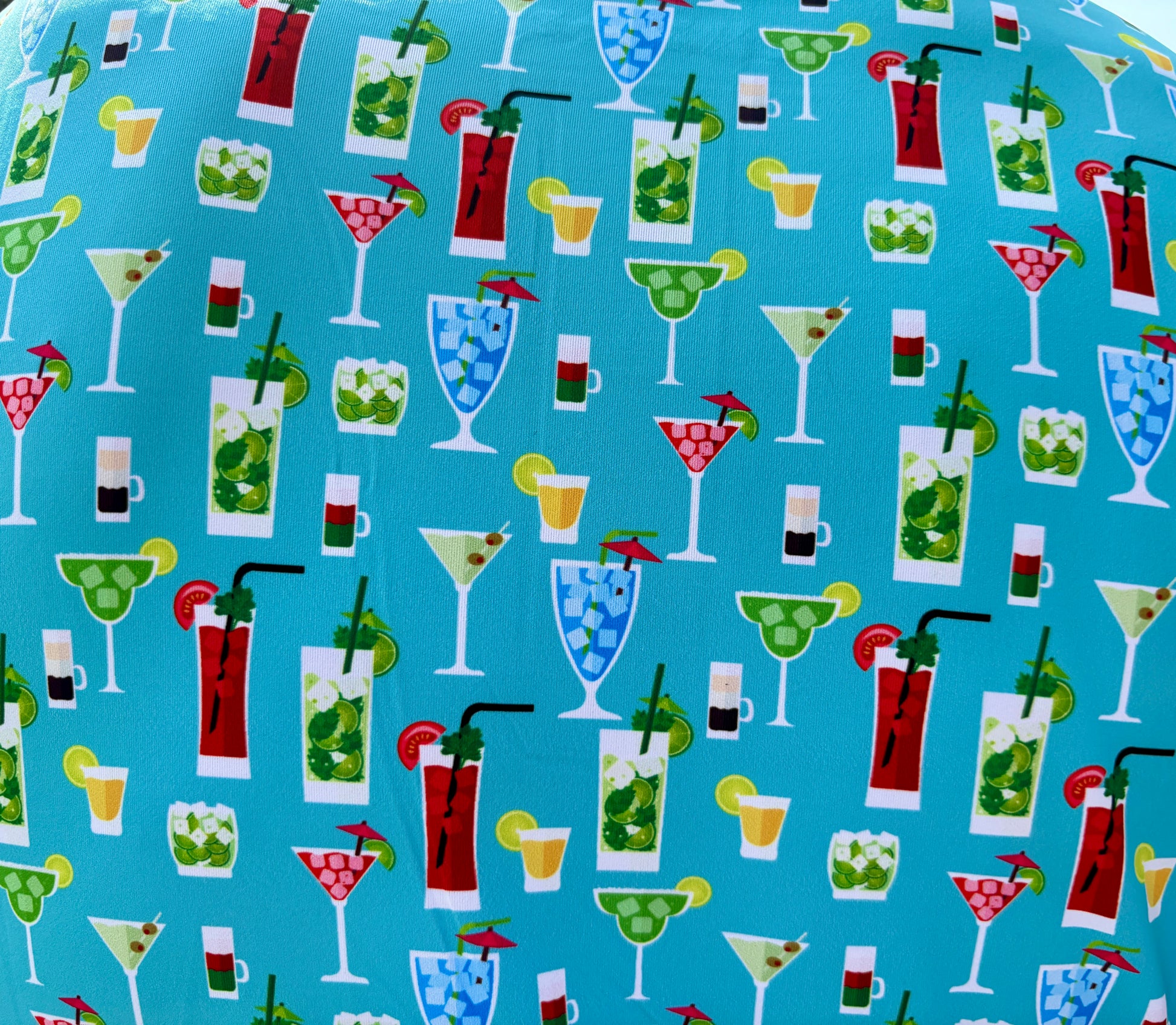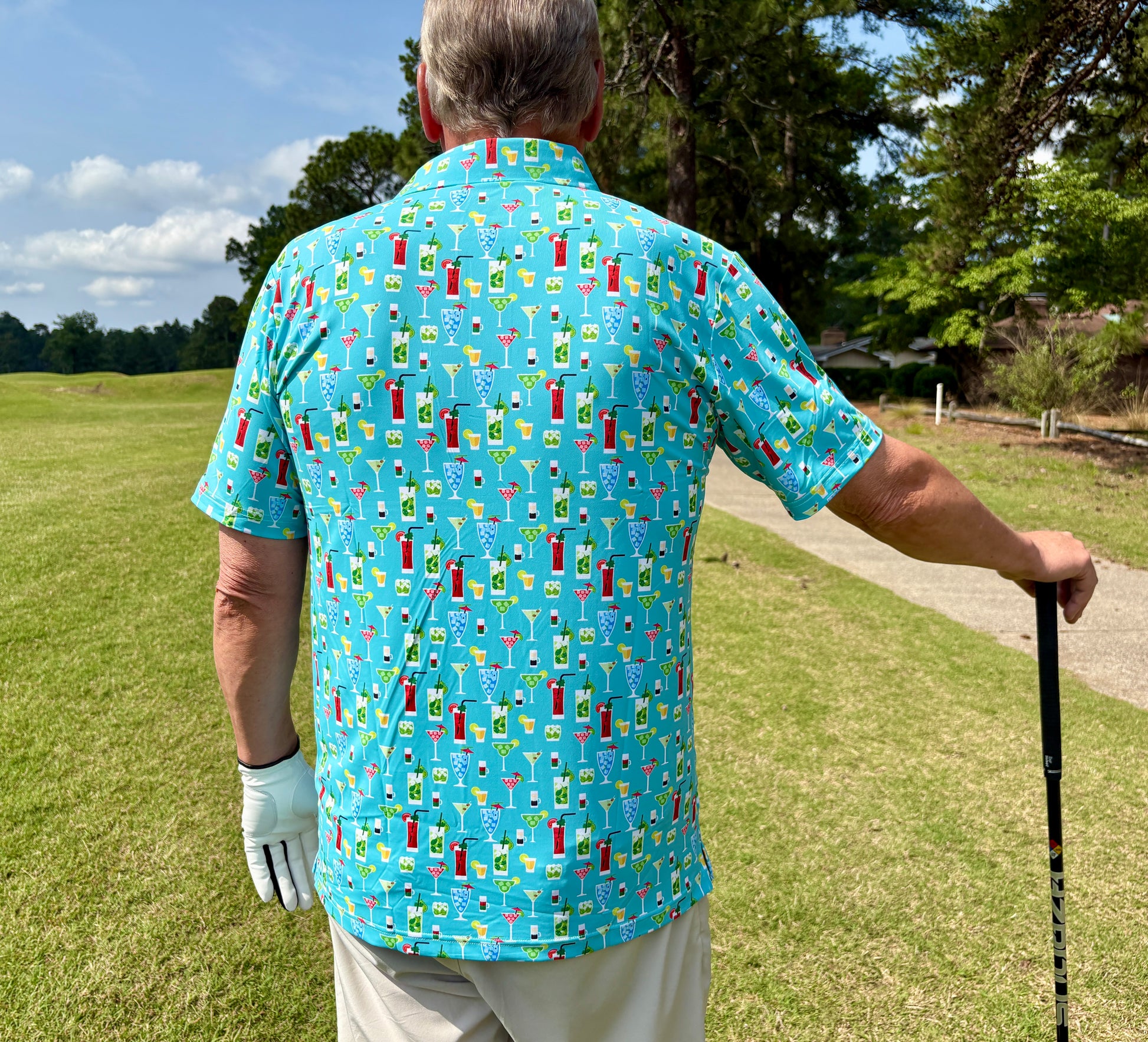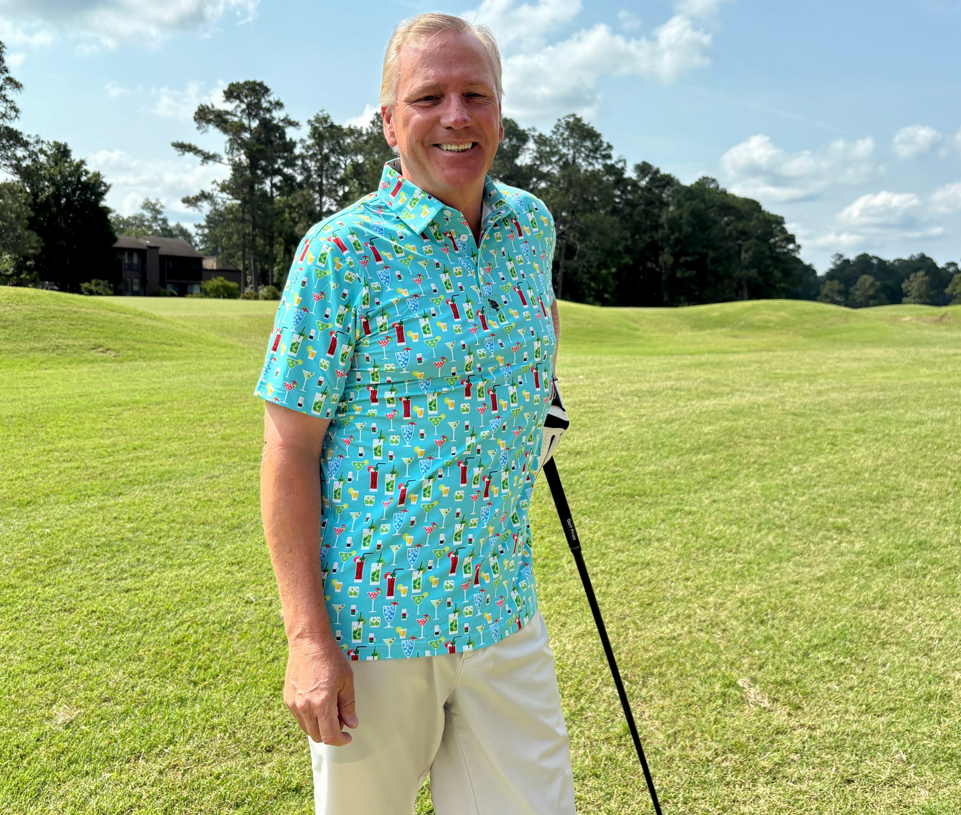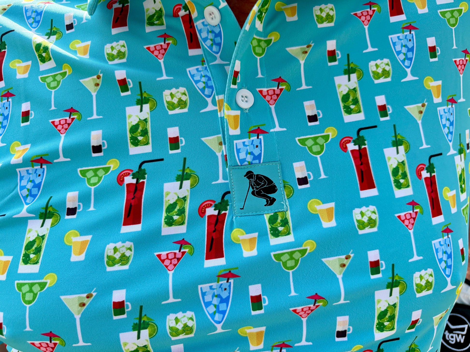 Unleash your playful side with our Cheers Short Sleeve Polo! This fun print showcases all sorts of drinks, making you want to get more birdies for a chance to celebrate with "birdie juice"! Choose from a button down sleeveless or a short sleeved version for women, both featuring the iconic Putter Girl logo. And now we have a Putter Guy Short Sleeve polo, too! Get ready to smile and have a blast on the course! Match your favorite Guy on or off the course! Available in Men's sizing Small to 2 XL and Women's in Small to 4 XL. We are finding this new shirt running a little small so we are recommending sizing up one!
