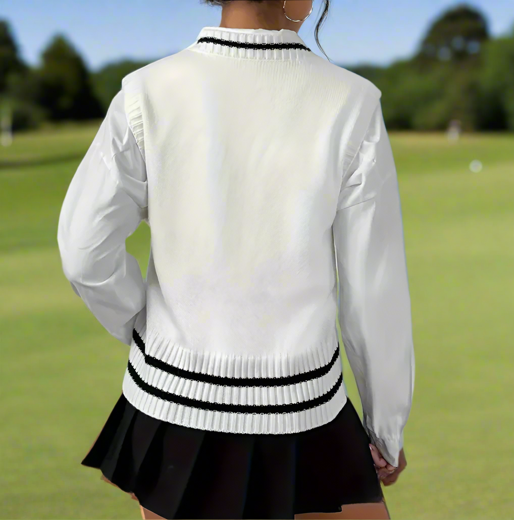 Get ready to hit the golf course or the town in style with our Classic Sweater Vest! With a classic V-neck and classic colors, this vest is perfect for any occasion. Stay fashionable and comfortable all day long weather you are playing golf or just playing around!!!! So soft and comfortable! Comes in Carolina Blue with White Trim or White with Back Trim.