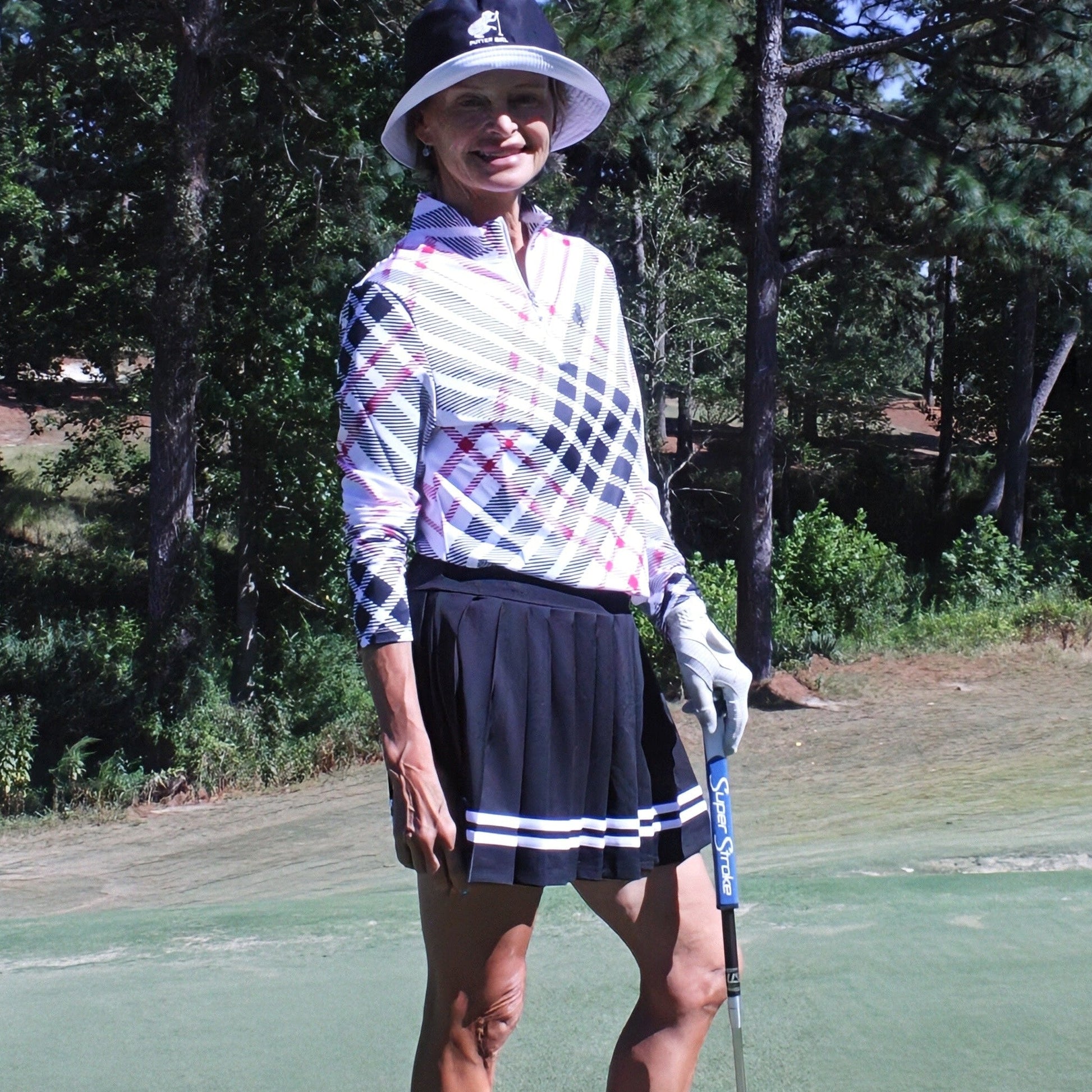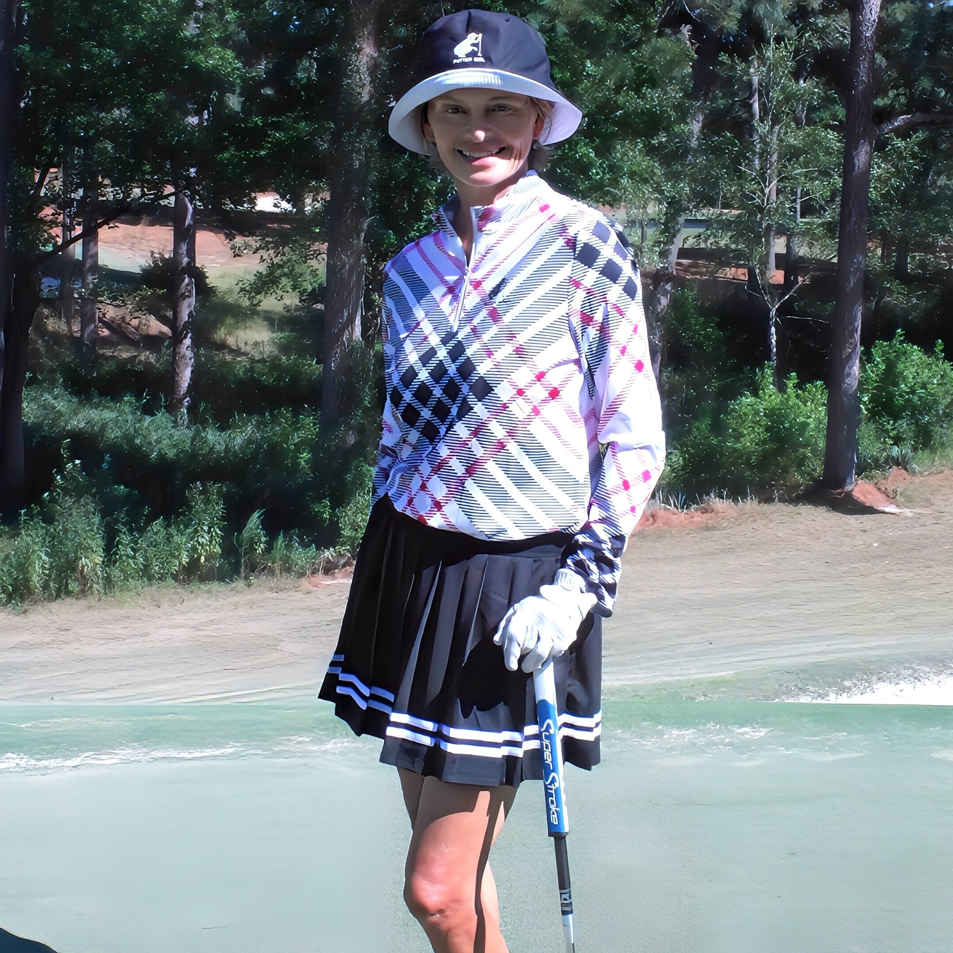 You asked...and we listened! You LOVED our Criss Cross Sleeveless Polo (we only have 1 left in stock!!)...so we brought out a long sleeve version in a limited supply for fall! Our Criss Cross Long Sleeve Polo looks so cool and crisp! Fabulous with our Long Red or Long Black skirt, our Pleated skirt or our Putter Girl Pants in black! Featuring our ever so popular Polyester-Spandex blend, you will love how this shirt feels. Zipper collar.