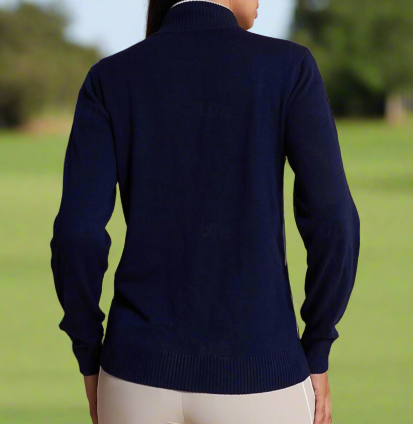 This classic and feminine argyle sweater in navy, pink and white is a MUST HAVE for your fall collection. Soft and comfy with a half zip collar. Looks amazing with our navy Putter Girl pants! We did a unique blend of materials on this one to keep it soft and airy...but still warm and snuggly! Wear it with our Navy Putter Girl Pants!