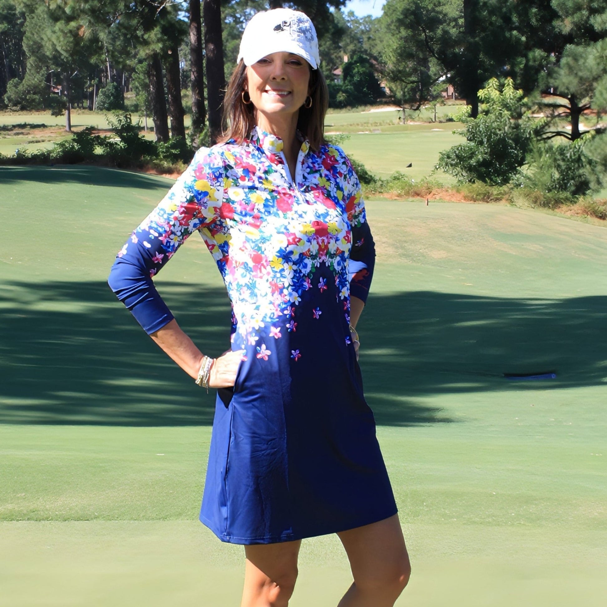 Welcome to our first long sleeve dress! With zipper front and two side zipper pockets this dress is perfect for fall golf or even spring and summer when you want to keep the sun off your arms! Great for layering as well with our Best Vest in white! Comes with separate under shorts.