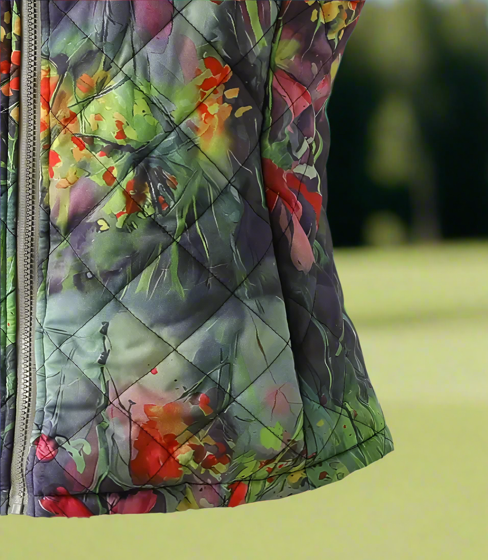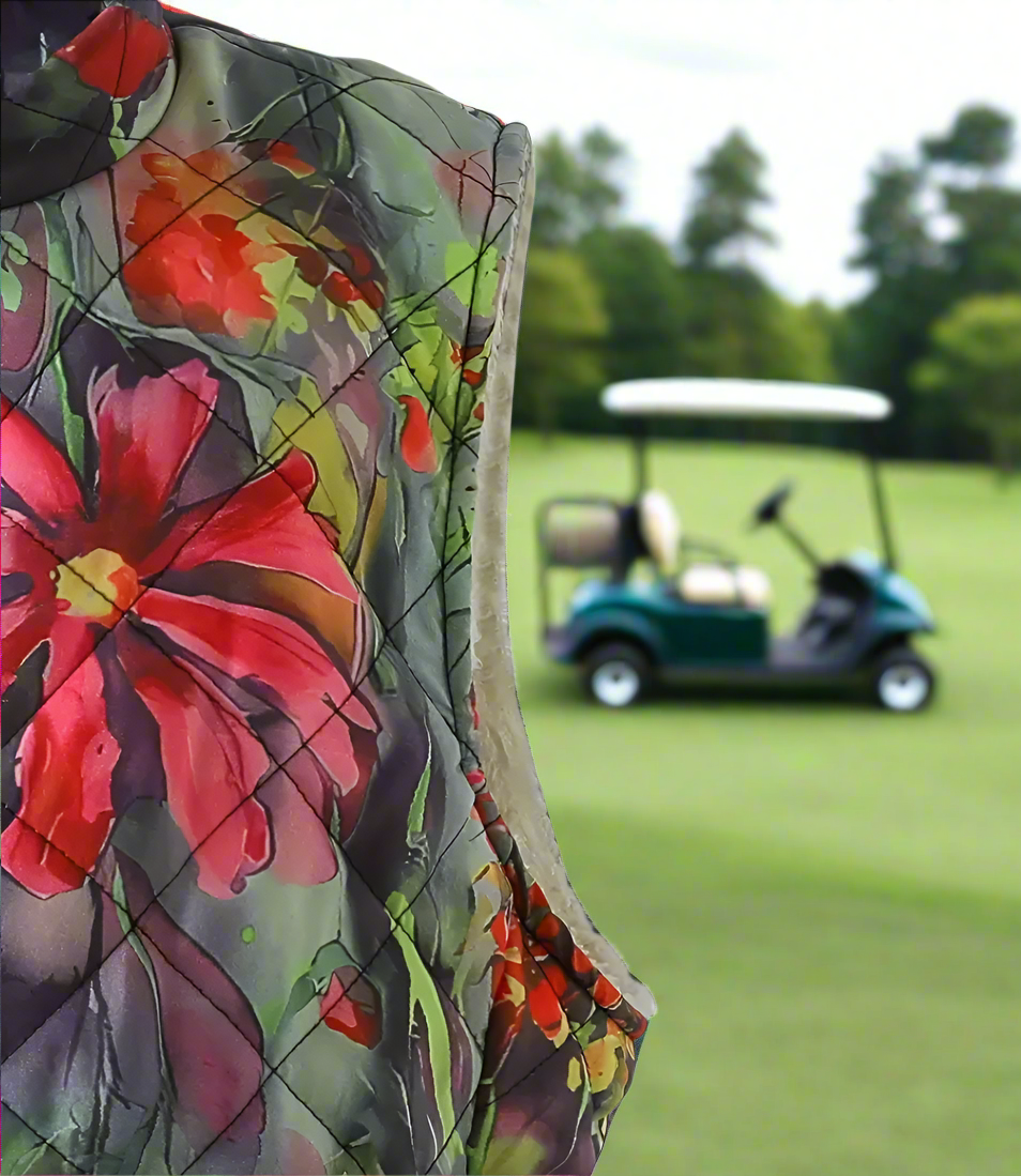 Want to look oh so pretty on or off the course? Try this multi colored quilted vest with two pockets available in two pretty colors! The inside is a soft fleece sure to keep you warm! The stitching adds a classic finished look. Wear with our coral colored 5 Pocket skirt or our Classic skirt in Navy!
