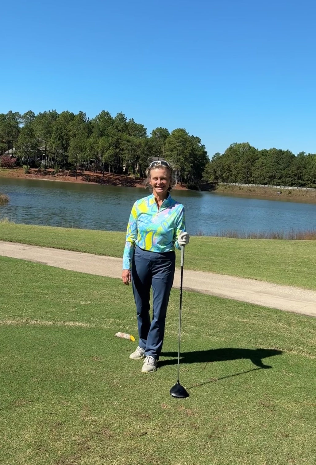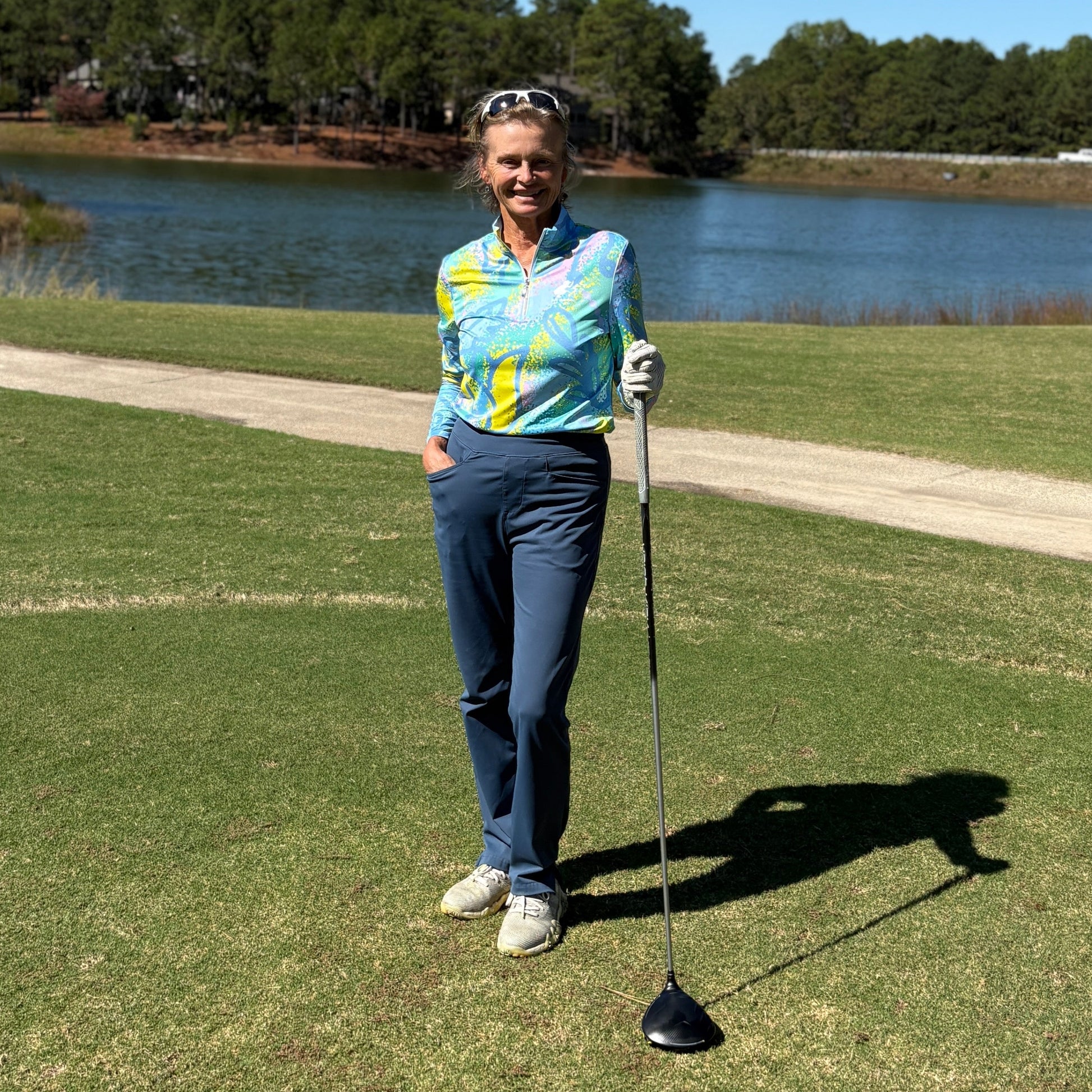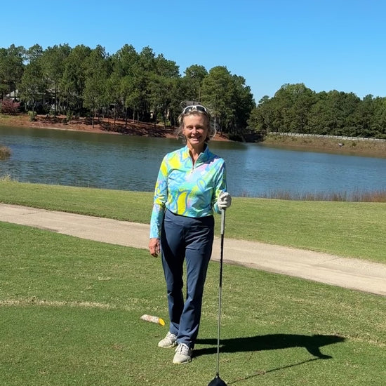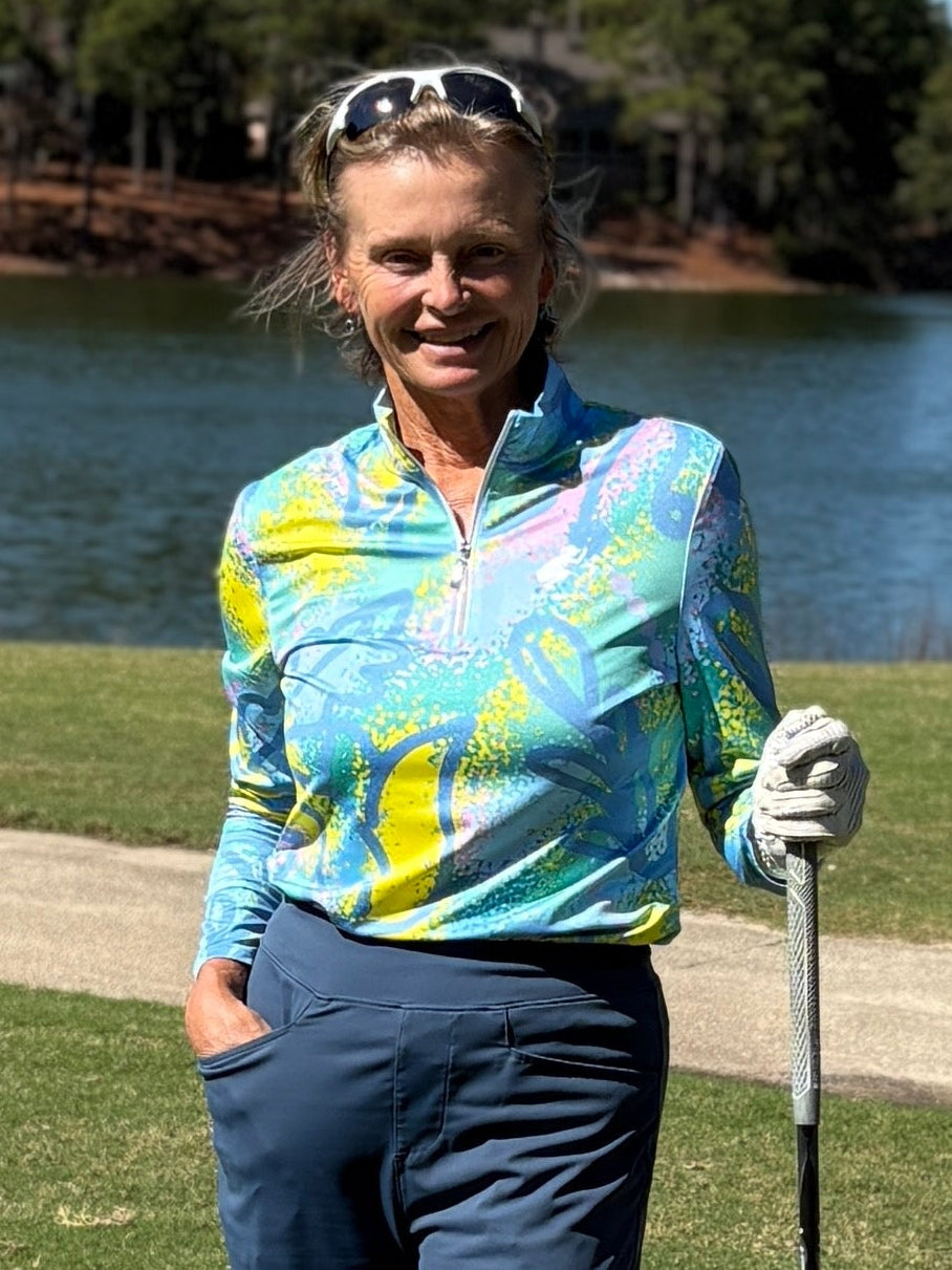 Looking for another one of our long sleeve polo's to add to your collection? This tulip patterned long sleeve with 1/2 zip collar is the perfect one! With fun colors of blue, yellow, pink and green you can wear it with almost anything! We love it with our Putter Girl Pants in slate blue!