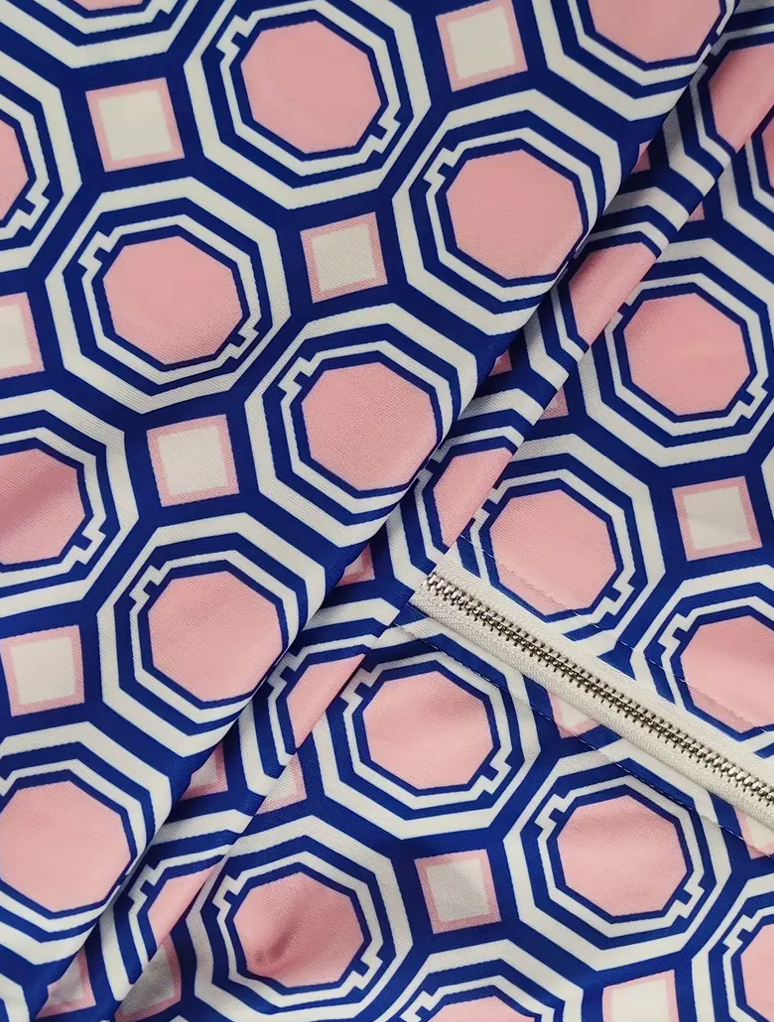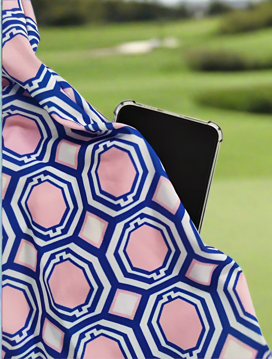 This pretty blue and pink sleeveless dress with a zipper stand up collar is sure to make you look great on or off the course! Side pockets. The hexagon shaped pattern offers a very slim looking style! Comes with separate panties!
