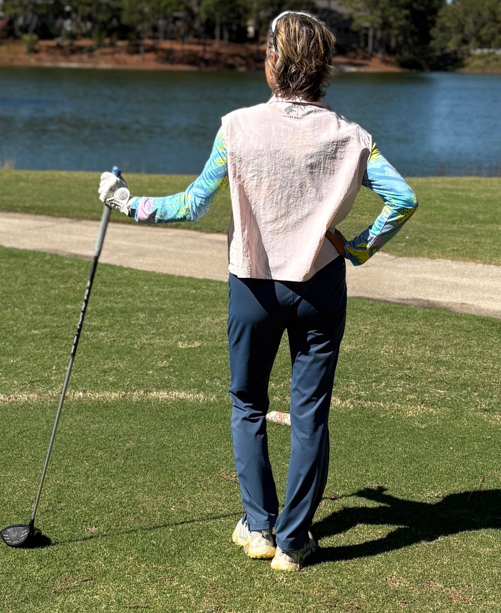 We’re obsessed with this lightweight vest! Perfect for layering or just adding a bit of cozy warmth during those crisp fall days. Great pockets! The lovely pink shade pairs perfectly with tons of our fall polos and Putter Girl Pants!