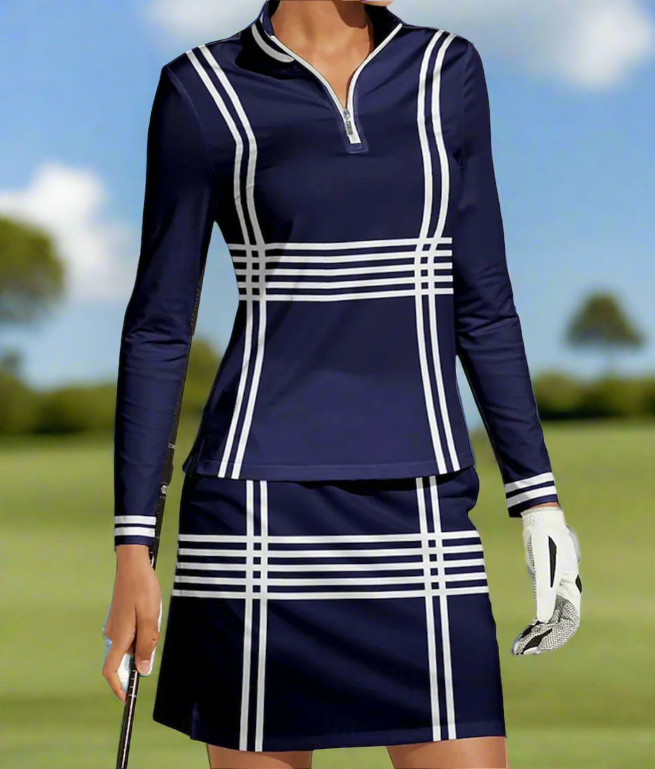 Get the Putter Girl Picket Fence Polo, Skirt and Sweatshirt together and save $25! For just $148, this trio keeps you looking sharp both on the green and off. Featuring a timeless navy and white combo, the polo has a handy zipper collar with SPF 50, while the skirt includes two side pockets plus built-in shorts with an extra pocket. The sweatshirt offers that finished look! Stylish and practical—what more could you want?