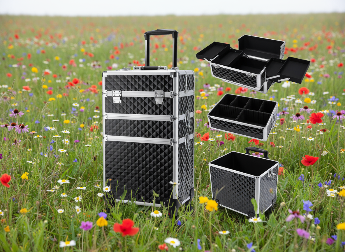 Going to a show? Why take large, oversized tack trunks when you can fit most of your necessary show items in this portable, durable Show Suitcase! Available in five fun colors, this "tack trunk" is perfect for brushes, braiding items, supplements, fly spray....you name it...you can fit all those smaller items into this rollable metal suitcase. The lower compartment fits your helmut! Lots of dividers to keep you and your horse organized! Lockable and rotating wheels for ease of transport. The top of the case is removable for a smaller case if you need something smaller at the show to head out to the ring with. This case is a MUST have for every Equestrian and SO practical!