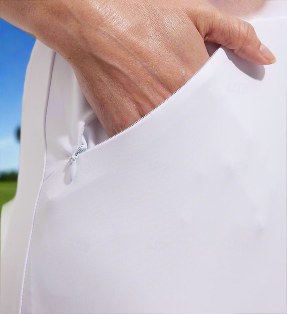 Swing away in this feminine pleated skirt with 3 pockets! Two zipper pockets in front and one pocket in back. Built in shorts as well! This oh so pretty skirt looks great with almost any of our Putter Girl polo's! Logo on back pocket.