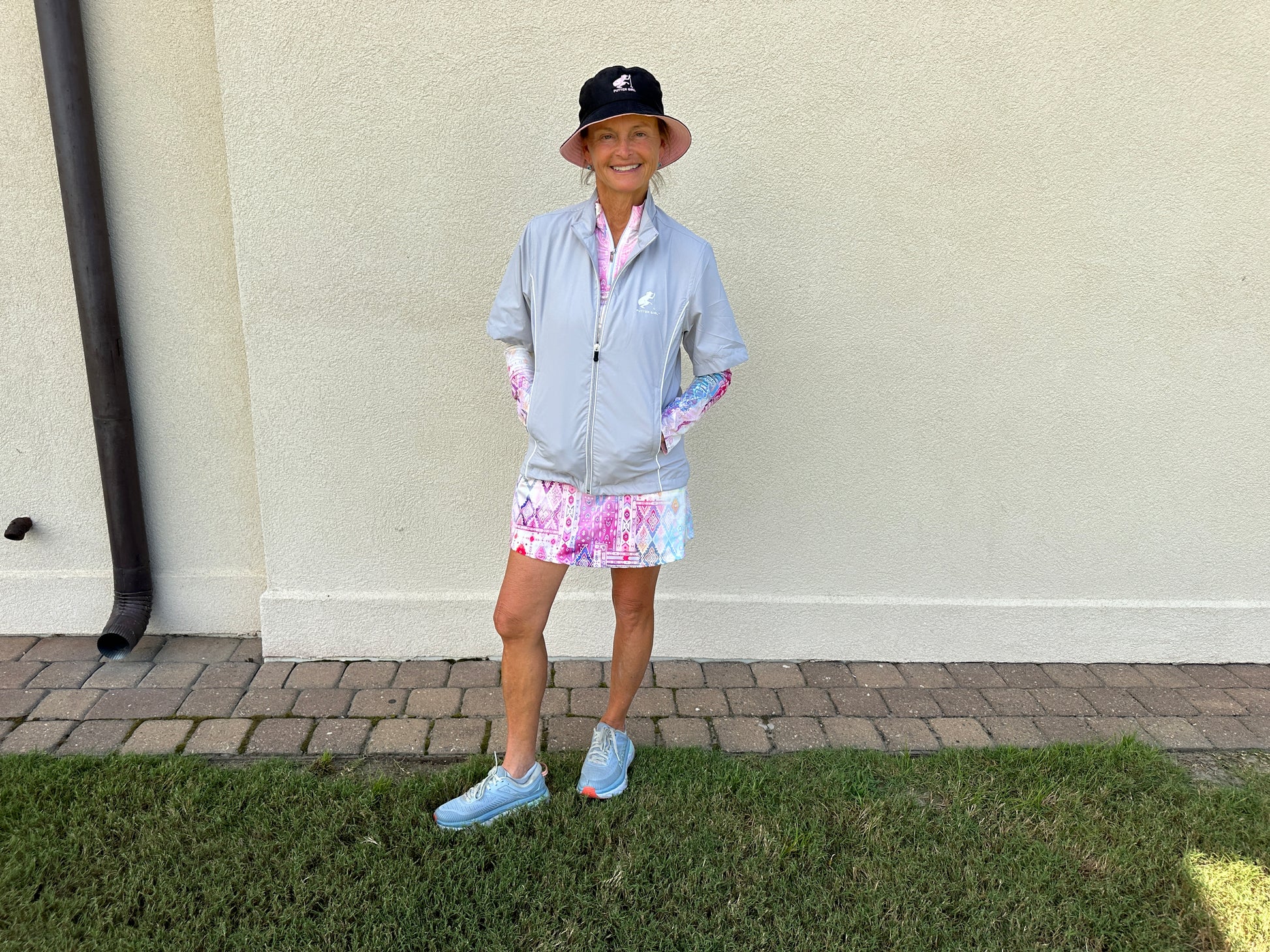 This half sleeve jacket is perfect to warm up in....or stay warm on or off the course! One of our favorites! Lightweight yet protective!