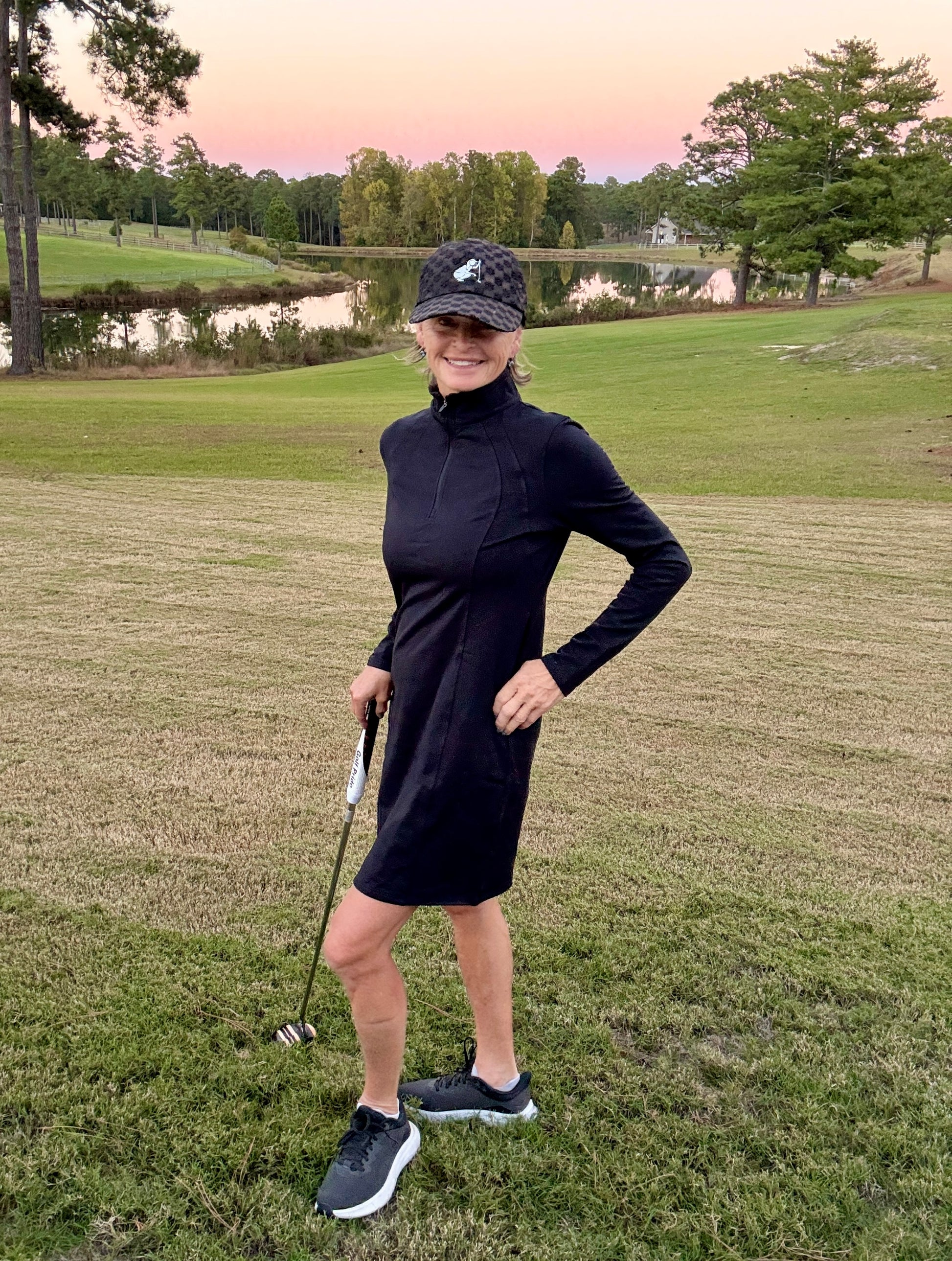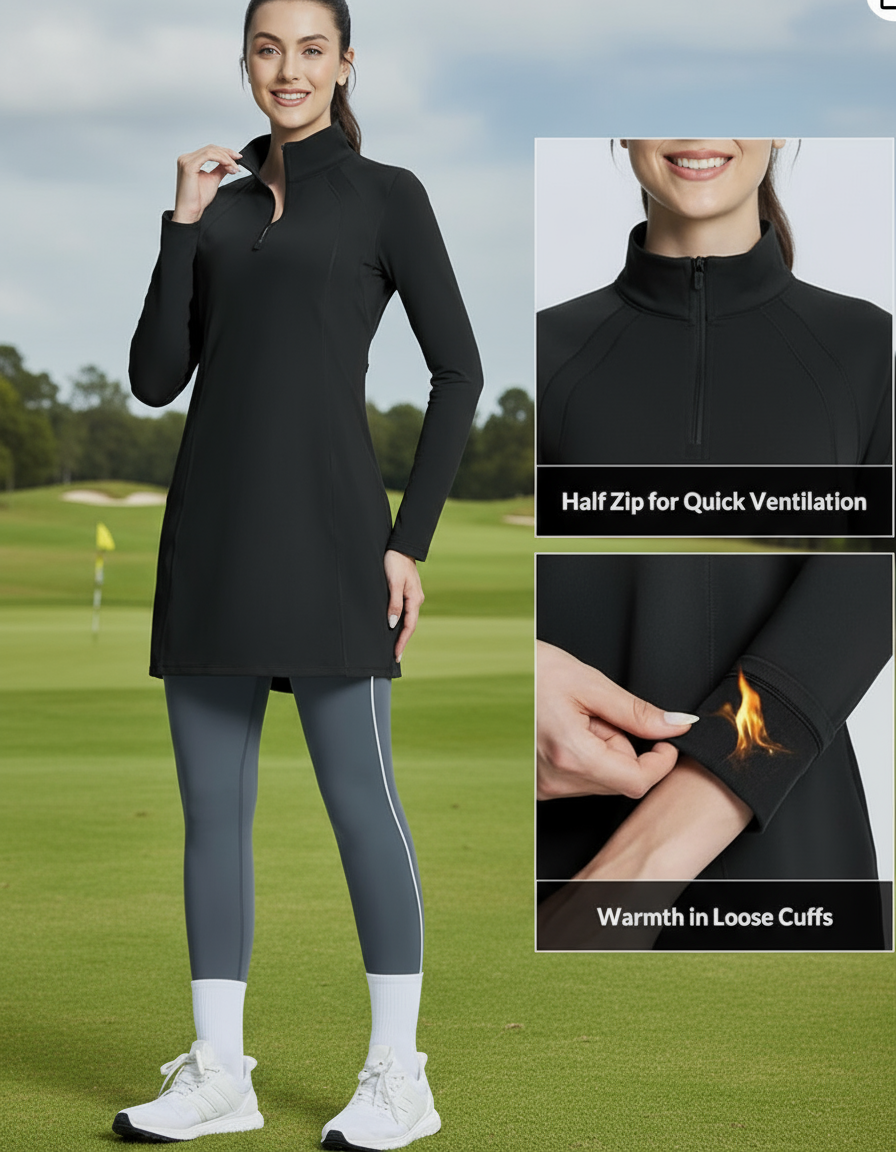 Cozy up in this micro fleece-lined dress that feels like a warm hug, keeping chills at bay both on and off the course! Its princess cut seams create a flattering shape, while deep side zipper pockets keep your hands toasty and stash your balls, tees, or phone. Featuring a high neck quarter-zip and stretchy cuffs, it’s ready to brave the cold or layer up as you please. Whether you're teeing off or just lounging, this dress is your go-to for snuggly winter fun!